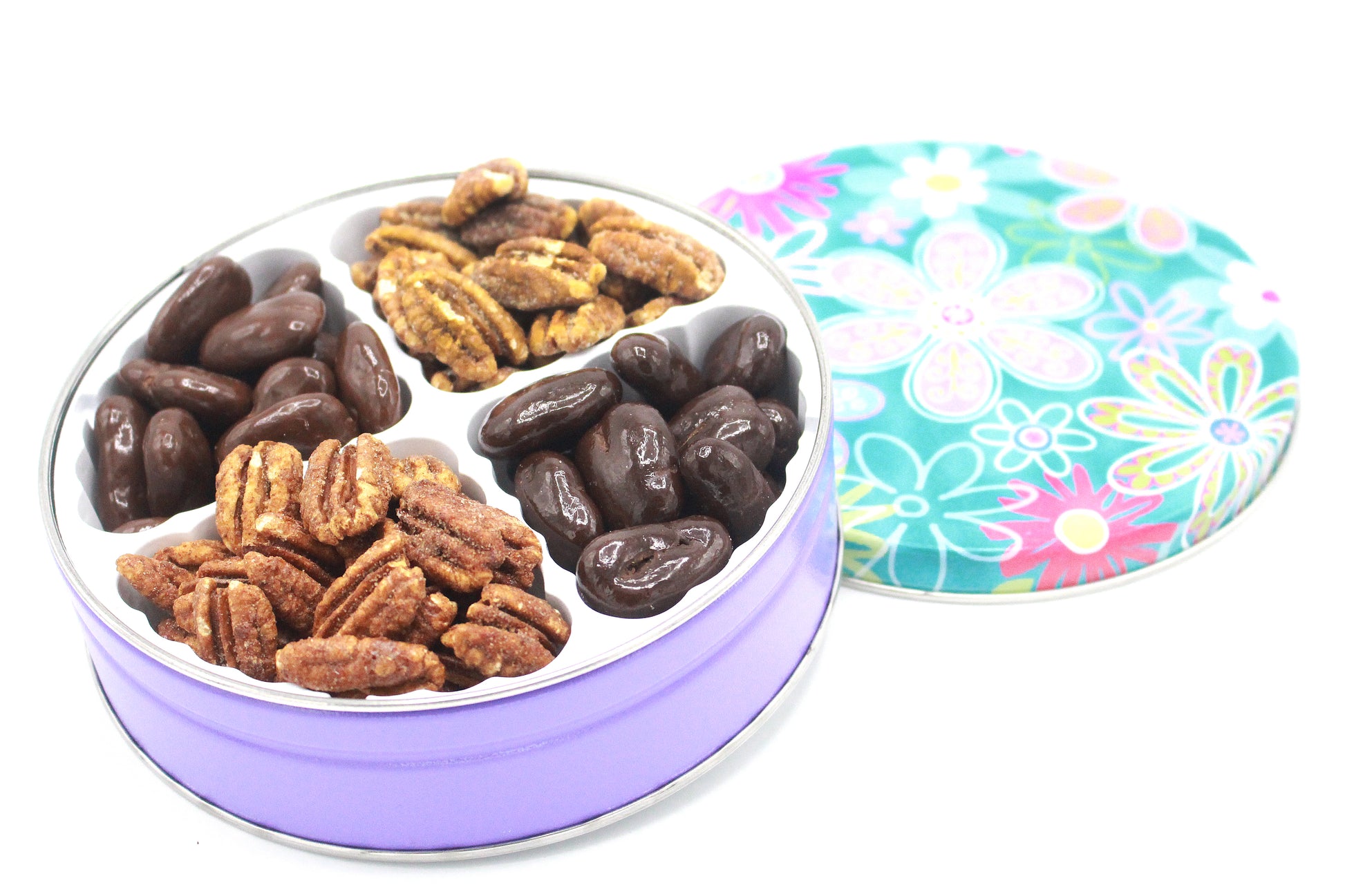 This 1 pound, 7" diameter classic gift tin is great for mailing! The Keepsake Tin is filled with our four best selling flavors of candy-covered pecans: Milk Chocolate Pecans, Dark Chocolate Pecans, Creamy White Pecans, and Praline Pecans.