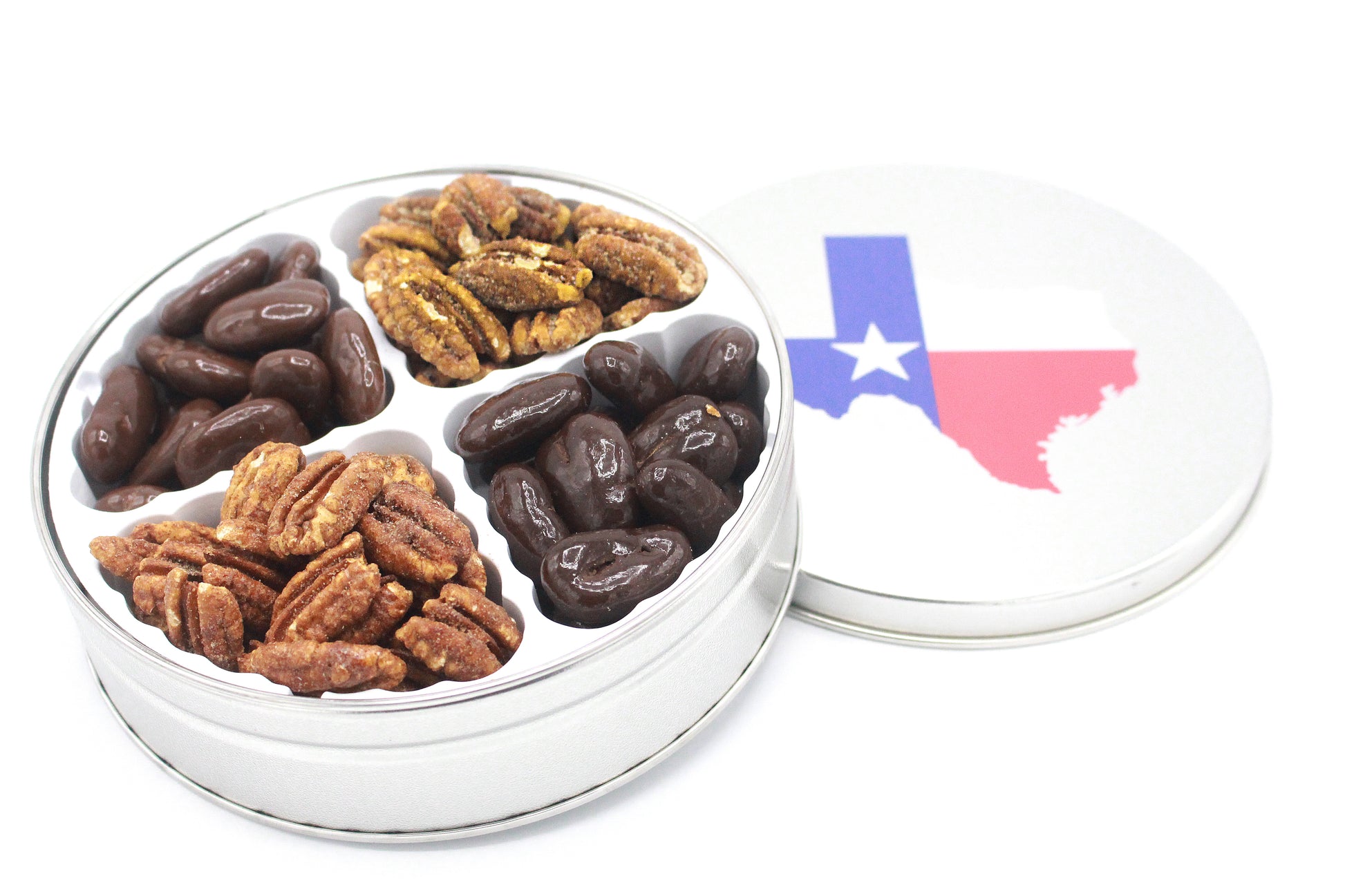 Texas Pecans in our Texas tin - there is no better way to send a bit of Texas to friends and family. The Texas Tin. is 7" in diameter and contains four of our most delicious candy covered pecans: Milk Chocolate Pecans, Dark Chocolate Pecans, Praline Pecans, and Cinnamon Pecans.