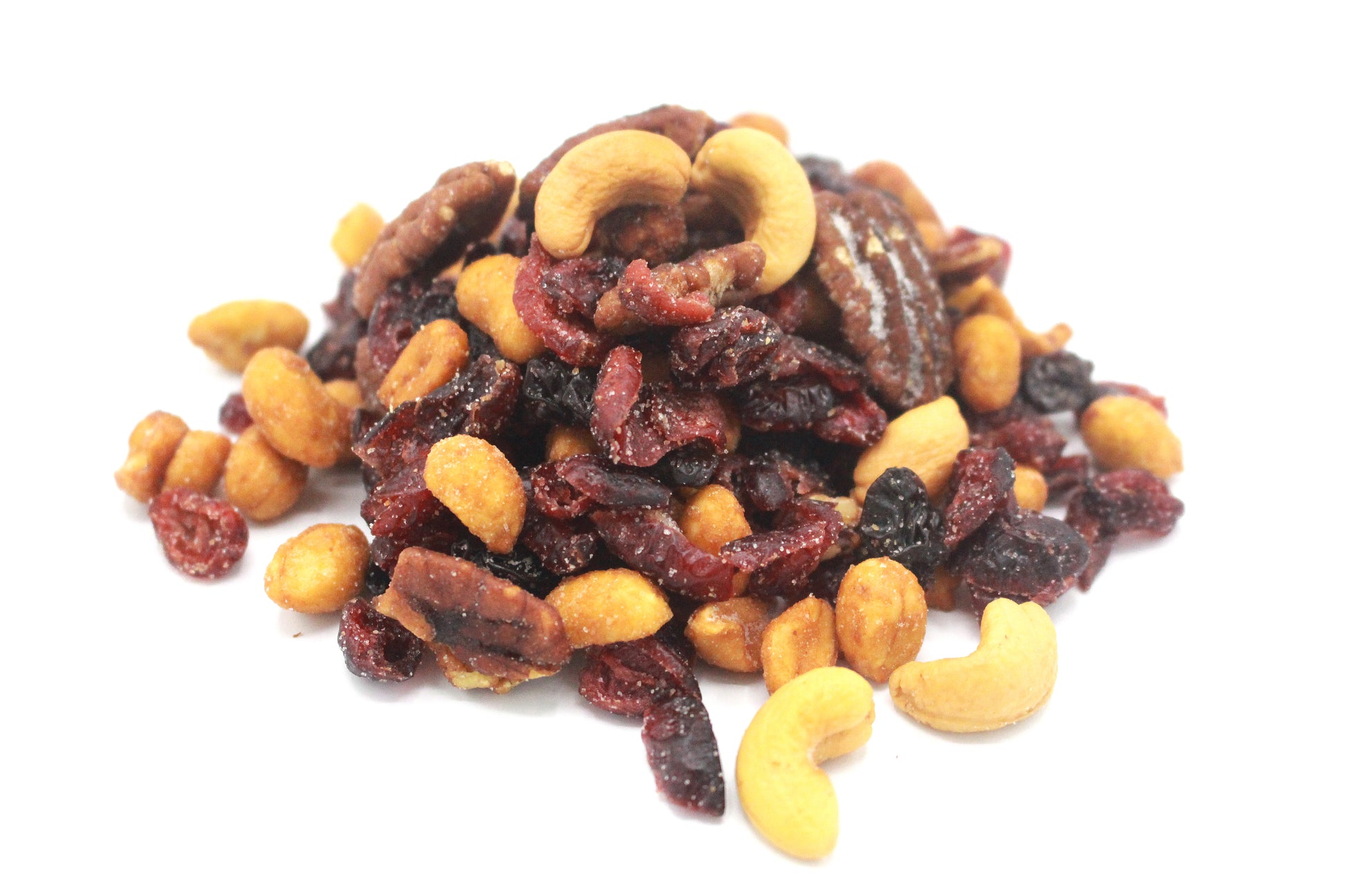 Boost your energy with this tasty snack mix of cranberry, raisins, pecans, cashews, and peanuts. Lightly touched with a sugar sprinkle. Grab and Go! Comes in 8 oz. sealed pouches of fun.
