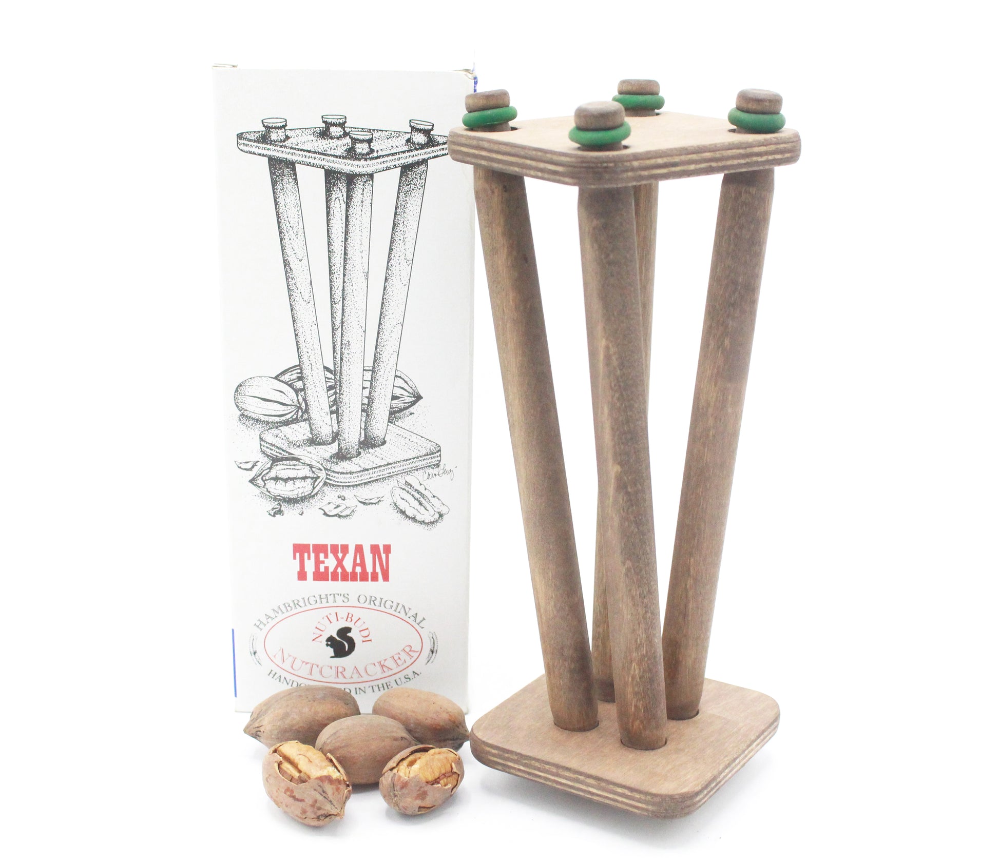 Twisting, handheld wooden frame to crush the pecan shell for easy peeling. Fun and easy way to crack the shell, just load up and twist!