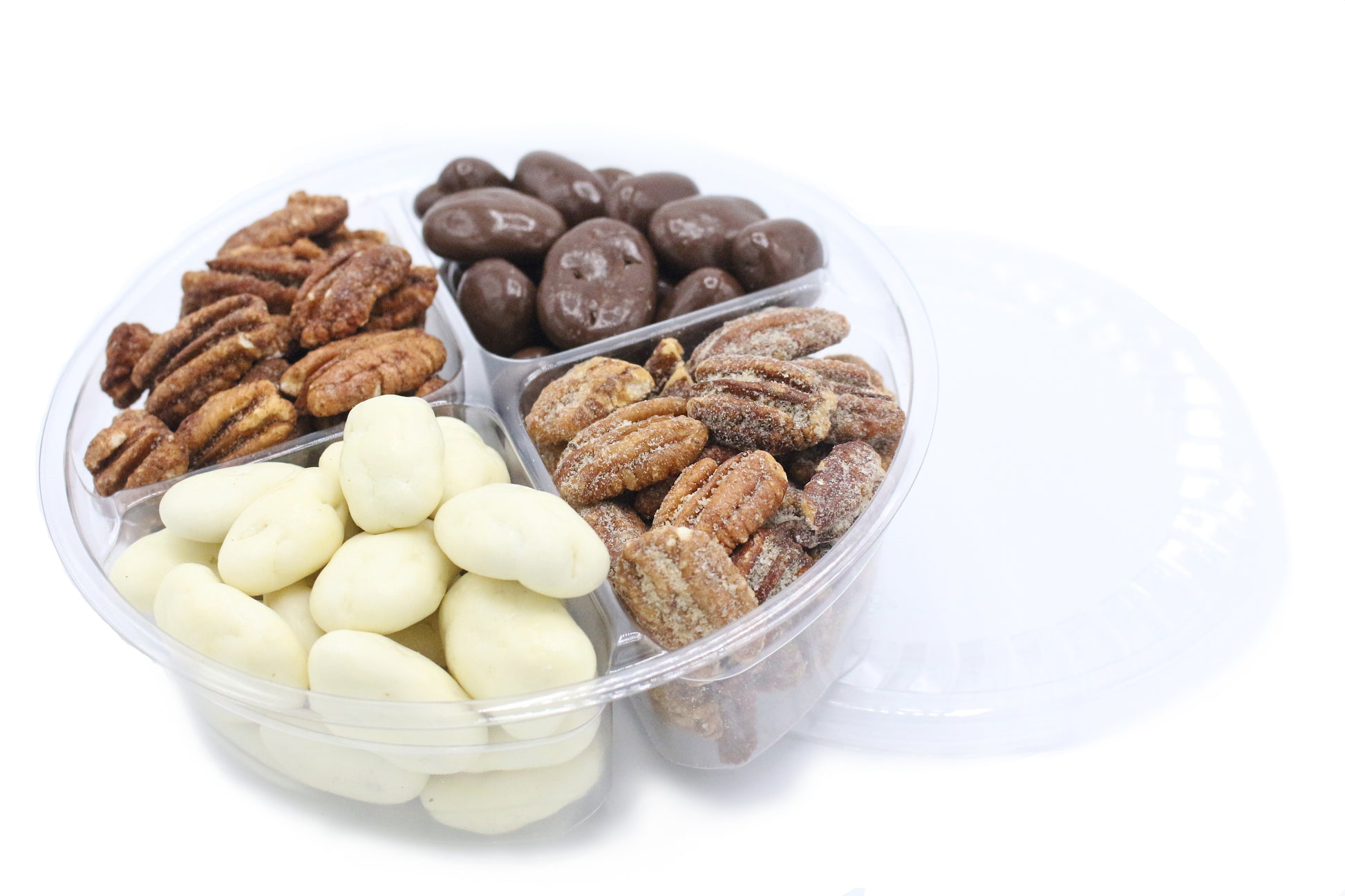 The Quatro Acrylic-container is filled with one whole pound of our four best-selling flavored pecans including Milk Chocolate Pecans, Dark Chocolate Pecans, Praline Pecans and Cinnamon Pecans.